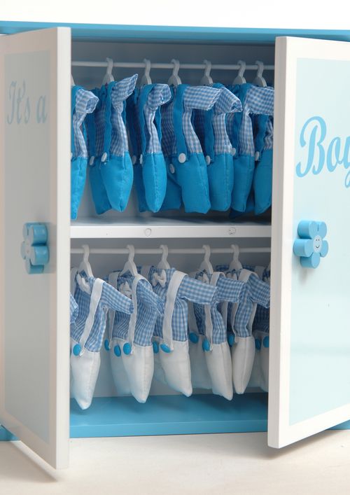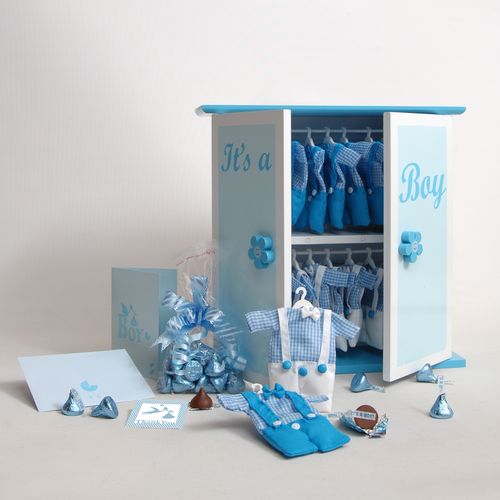 This special set comes in a beautifully designed Calypso Baby Boy hardcover box. Inside, you will find a custom designed wooden box, complete with dual hinged doors, which will make a great centerpiece for your party. This beautifully painted wooden box contains two bars for hanging miniature baby boy jumpsuits, with attached note tags. The set also includes “It’s a boy” Hershey’s kisses, miniature wooden hangers and blank invitation/Thank you cards with envelopes for party guests.