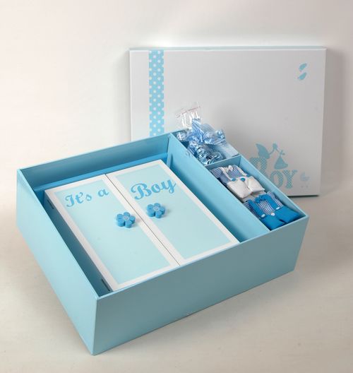 Our set comes in a beautifully designed Calypso Baby Boy hardcover box which includes; Calypso Baby Boy wooden box, miniature baby boy jumpsuits in blue and white colors, Hershey Kisses (“It's a boy” chocolates), invitation/Thank you cards with envelopes for guests, personal note tags, and jumpsuits